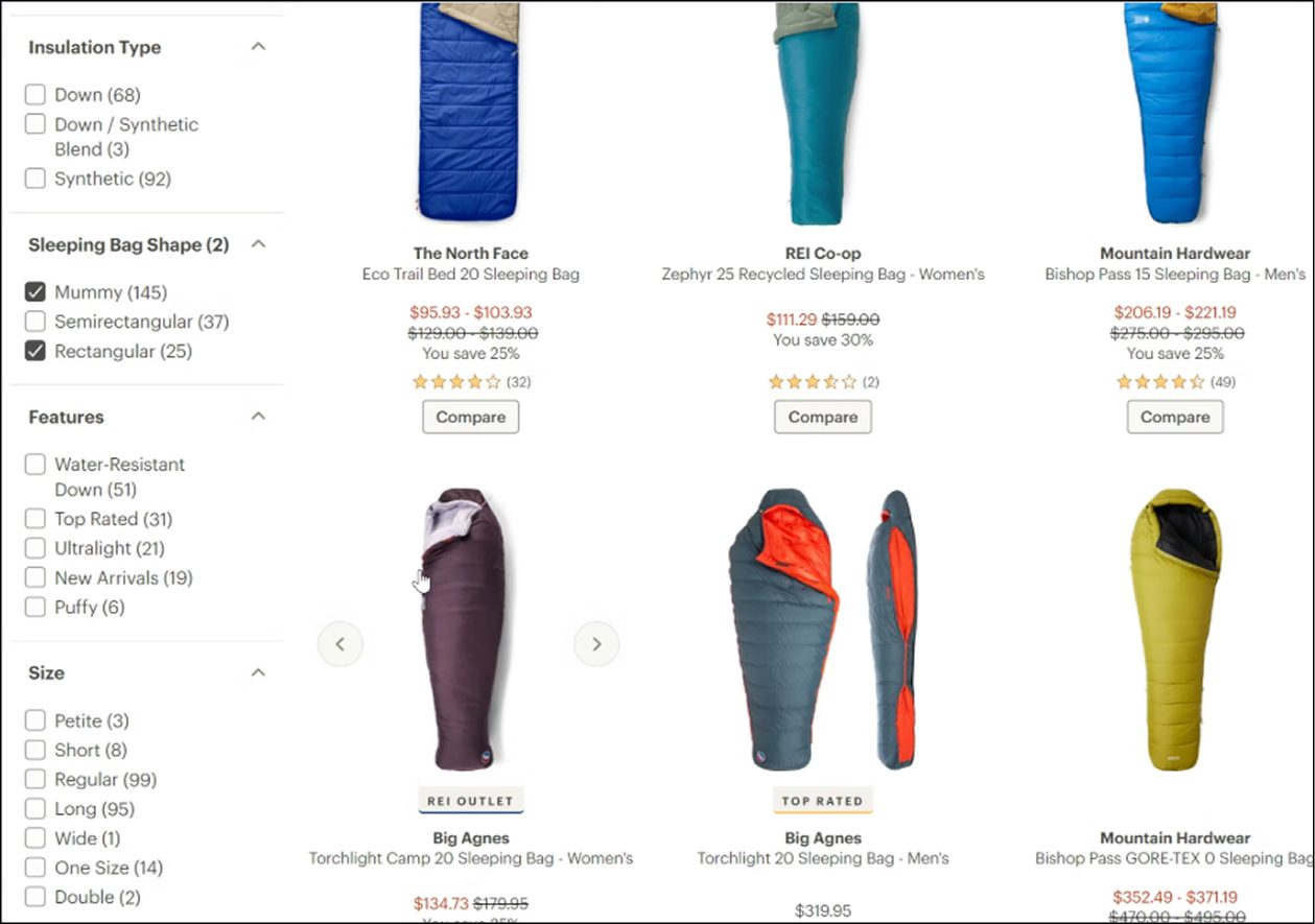 A fenti képen az látható, hogy egy outdoor webáruház külön kategóriákba sorolja a múmia és a szögletes hálózsákokat. Ennek az a problémája, hogy a felhasználó nem tudja egyetlen listában összehasonlítani a két terméktípust: több kategóriába kell átkattintania ahhoz, hogy mindkét hálózsák adatait megismerje. Így a hőtartó komfortfokozatok szerinti összehasonlítás is csak külön-külön listákban lehetséges. Ráadásul az is előfordulhat, hogy a felhasználó elsőre észre sem veszi, hogy a hálózsákok több kategóriában vannak szétszórva, ezért ha nem találja meg gyorsan a keresett terméket, könnyen elhagyhatja az oldalt. Az alsó képen látható webáruház ezzel szemben helyesen egyetlen „Hálózsákok” kategóriát használ, ahol a felhasználó egy listában láthatja az összes típust, és szűrőkkel állíthatja be, hogy csak a múmia vagy csak a szögletes hálózsákokat szeretné megjeleníteni.