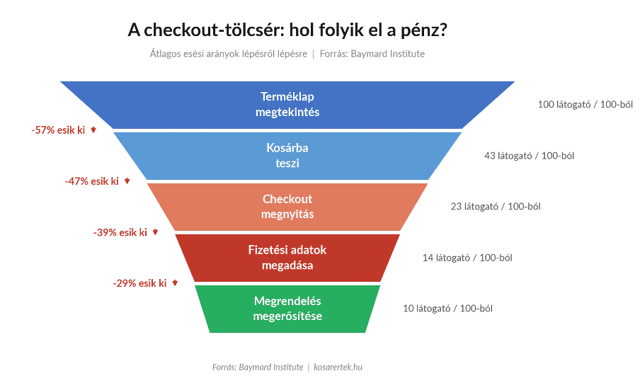 A checkout-tölcsér: átlagos esési arányok lépésről lépésre (forrás: Baymard Institute)