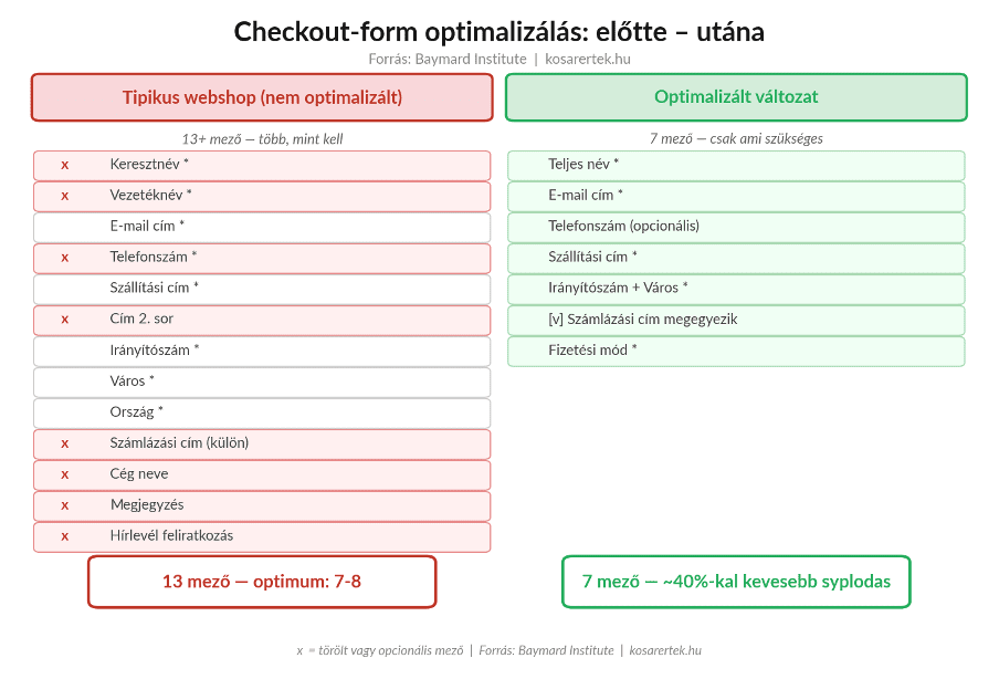 Az átlagos webshop checkout-formja alapértelmezetten 11+ mezőt tartalmaz – de az összes jelen lévő elemmel együtt ez könnyen 20 fölé kúszhat. Az optimum 7–8 kötelező mező.*