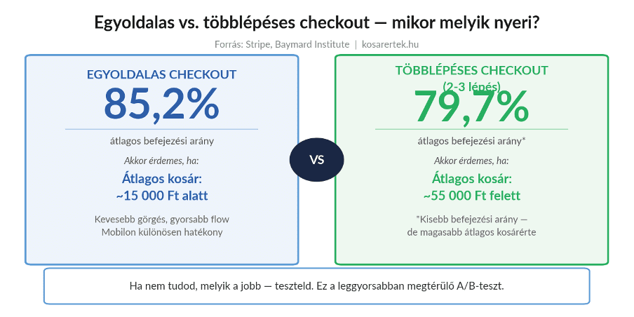 A különbség az átlagos kosárértéktől függ. Ha az átlagos rendelési értéked körülbelül 15 000 Ft vagy ezalatt alatt van, az egyoldalas checkout megnyeri a csatát – kevesebb görgetés, gyorsabb flow, mobilon különösen hatékony.