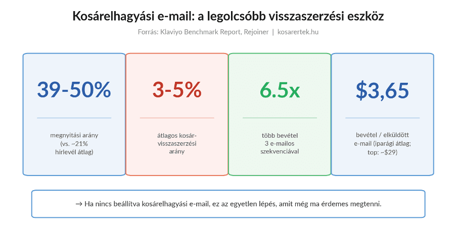 A kosárelhagyási e-mailek megnyitási aránya 39–50 százalék, szemben a hírlevelek ~21 százalékos átlagával. Egy három e-mailes szekvencia átlagosan 6,5-szörös bevételt generál egy egyedi e-mailhez képest. Ha nincs beállítva – ez az egyetlen lépés, amit még ma meg tudsz tenni. (Forrás: Klaviyo Benchmark Report, Rejoiner)
